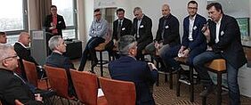 Moderator Daniel Mund von der GLASWELT (l.) und die Teilnehmer der Diskussionsrunde (v. l.): Ralf Maus (Glas-Fandel), Dr. Wolfgang Wittwer (Kömmerling Chemische Fabrik), Matthias Dick (Sika), Joachim Hauns (Aluplast), Michael Walther (Urban), Hans-Jürgen Rieger (Heinrich Meyer-Werke Breloh)