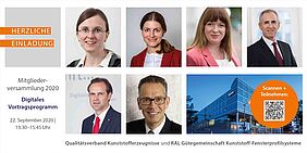 Die Vorstände und Geschäftsführung von Gütegemeinschaft Kunststoff-Fensterprofilsysteme und Qualitätsverband Kunststofferzeugnisse begrüßen alle Mitglieder und Interessierten per Live-Schaltung aus dem Dorint Hotel in Mannheim, dem ursprünglich geplanten Veranstaltungsort.